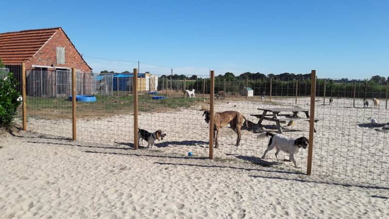 Ook hangen er grote schaduwdoeken, zodat de honden in de schaduw kunnen gaan liggen.